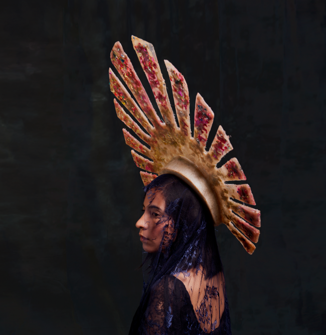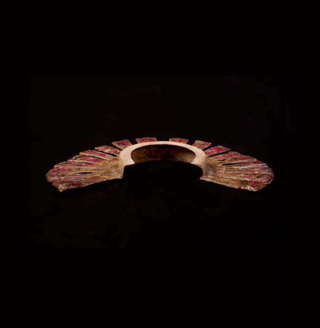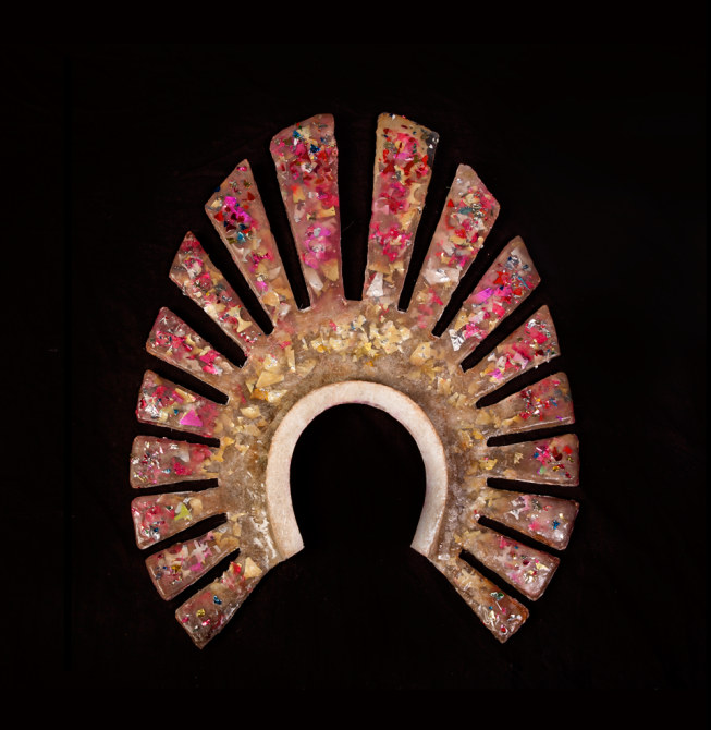 Inspired by the Popular Peruvian Religion, which mixes Catholicism and pre-Hispanic practices. It is common to find references to natural elements and ancient deities hidden in symbols. The crown, made of concentric rays, has different associations. The shape reminds an aureole used by figures of saints and at the same time makes reference to the lineal descendants of the sun.
