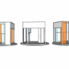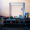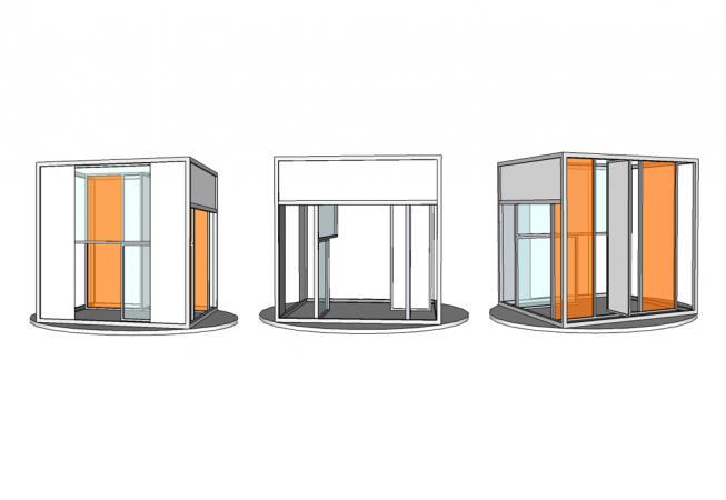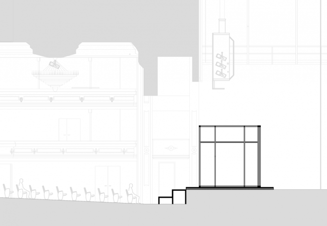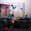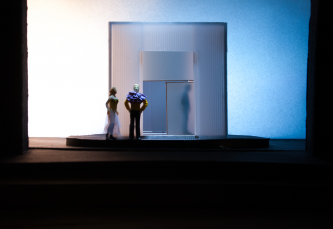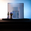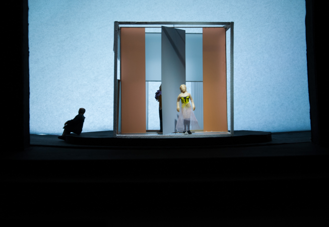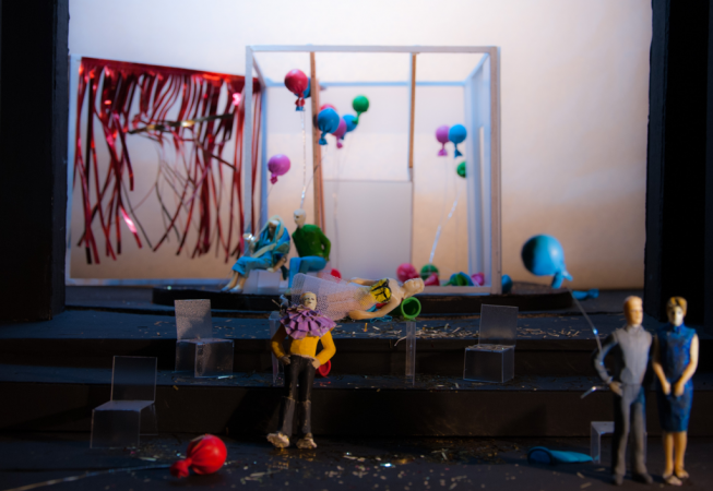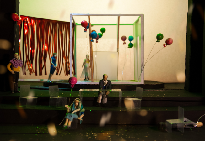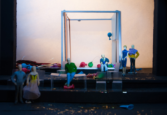 The central element is a box placed on a rotating platform that shows the different perspectives of the characters, each one in its own little world. It consists of various frames with different functions (open, slide, pivot,) allowing quick changes and playful situations. Throughout the play all the props pile up and the decoration gets destroyed, giving a devastating ruinous atmosphere at the end.